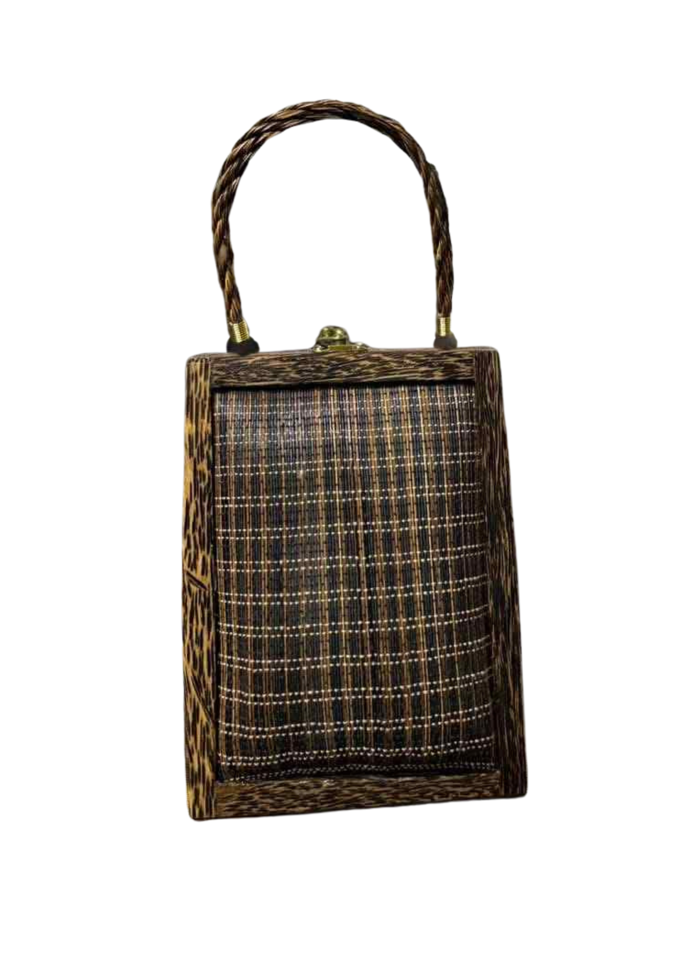 กระเป๋าทรงกล่องตั้ง โครงไม้ตาล หน้าสานใยตาลลายตารางแน่น เนี้ยบทุกมุม หูหิ้วถักถือสบาย ลุควินเทจแต่ยังโมเดิร์น ใส่มือถือ กระเป๋าสตางค์สั้น คีย์การ์ด และของจุกจิกได้ครบ เหมาะทั้งทำงาน/ดินเนอร์