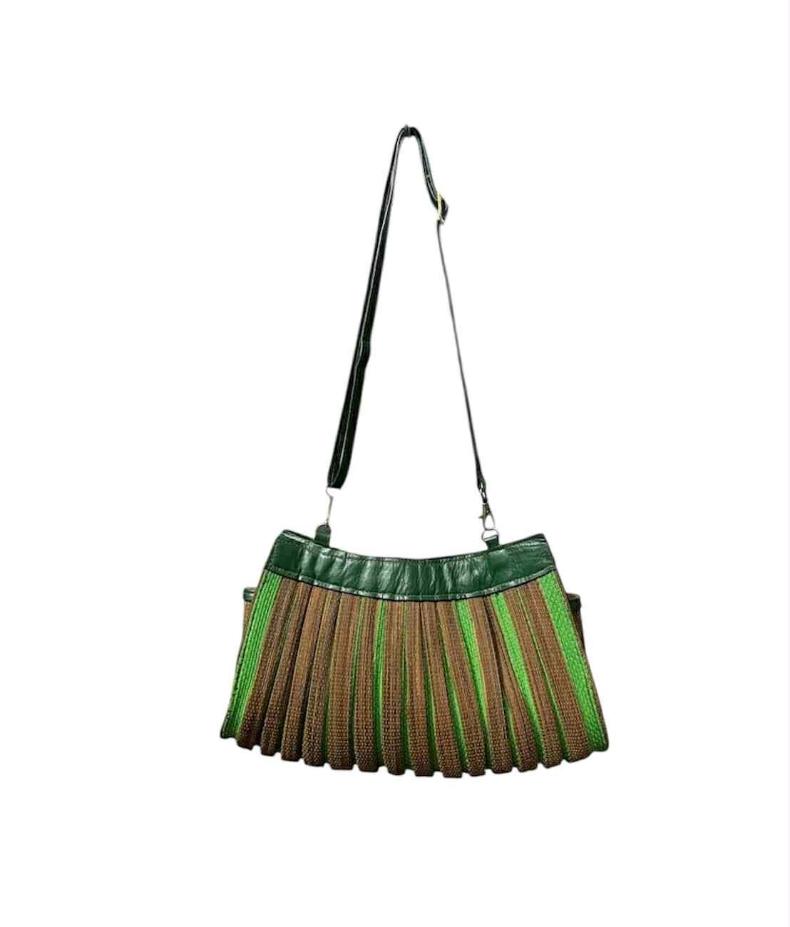 กระเป๋าสะพายทรงโค้ง จับจีบถี่รอบใบ สานใยตาล ตัดขอบหนังสีเขียว สายยาวปรับได้ ใส่มือถือ กระเป๋าสตางค์ยาว และของจำเป็นได้ครบ ลุคคราฟต์โมเดิร์น เหมาะทั้งไปคาเฟ่และวันทำงานสบาย ๆ