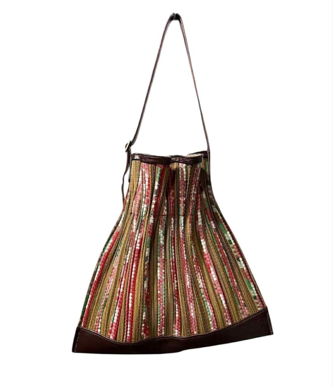 กระเป๋าสะพายไหล่ทรงระฆังคว่ำ จับจีบเป็นริ้วสวยรอบใบ สานใยตาลลายหลากสี ตัดขอบหนังสีน้ำตาล เพิ่มความแข็งแรงและโมเดิร์น ใส่ของได้เยอะแต่ยังดูพริ้วเบา เหมาะทั้งวันทำงานและวันเที่ยว