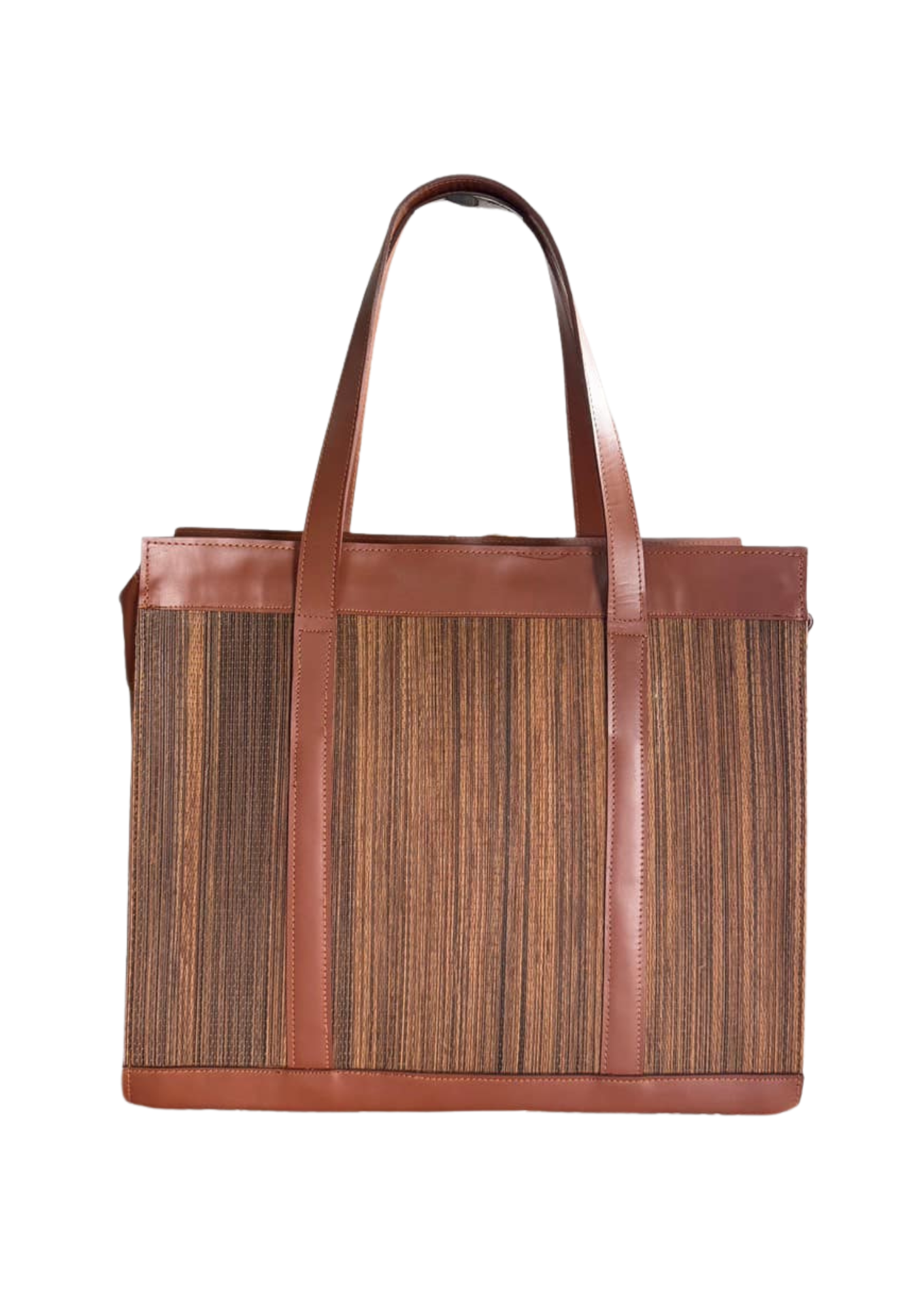 กระเป๋าโท้ตทรงสี่เหลี่ยม หน้าสานใยตาลลายริ้ว เสริมหนังคาราเมลรอบตัวและสายหูยาว สไตล์มินิมอลสุภาพ ทรงตั้งอยู่ตัว ใส่เอกสาร A4 และโน้ตบุ๊กได้สบาย เหมาะทั้งทำงาน ประชุม และเดินทางในวันเดียว
